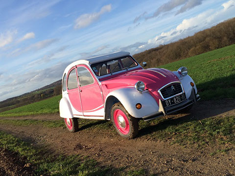 Pink est une 2cv de 1977 restaurée entièrement en 2015. Entièrement décapotable, elle peut accueillir jusqu'à 4 personnes.